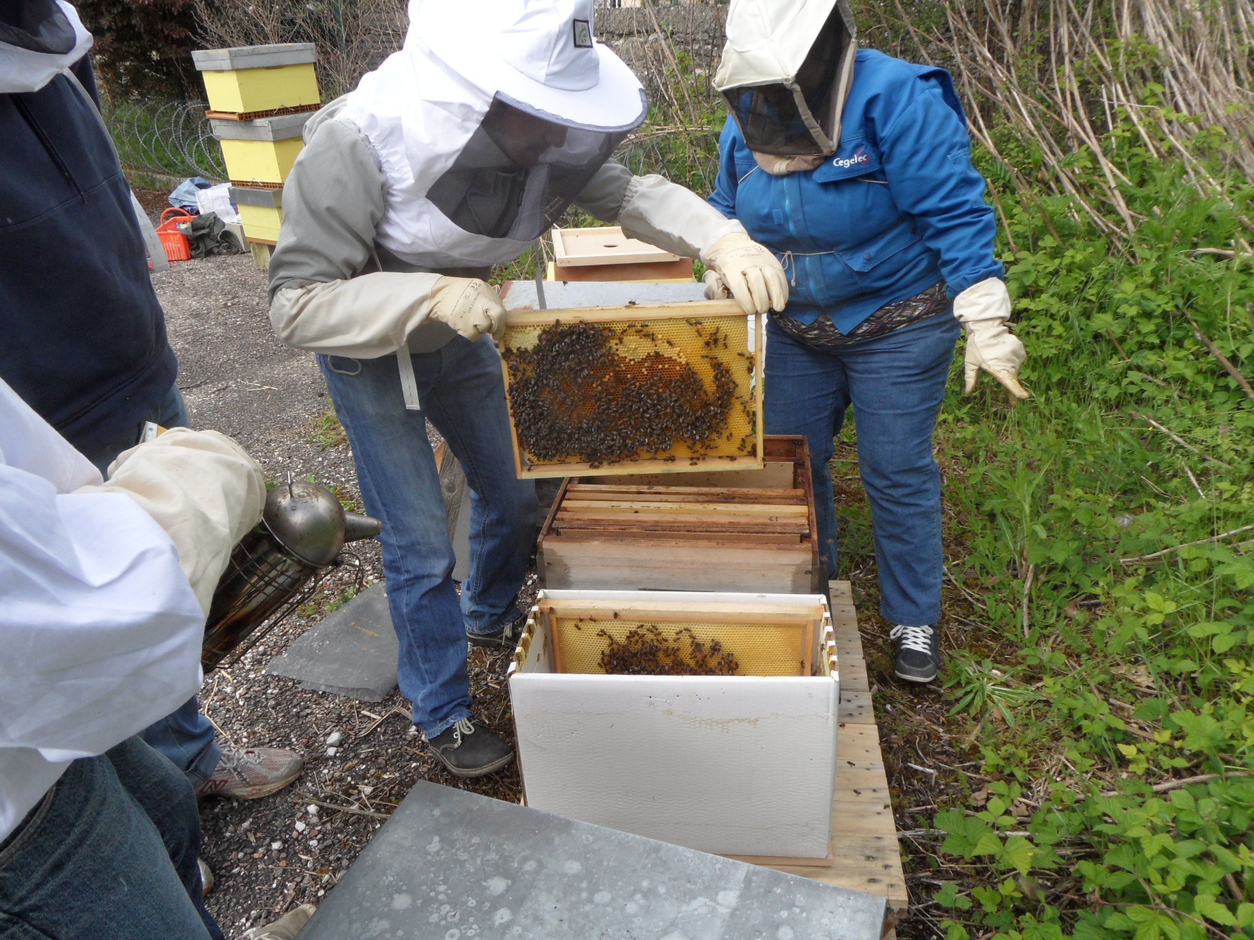 Ils ont appris a enfumer nos insectes et ont posé une hausse sur la ruche-école .